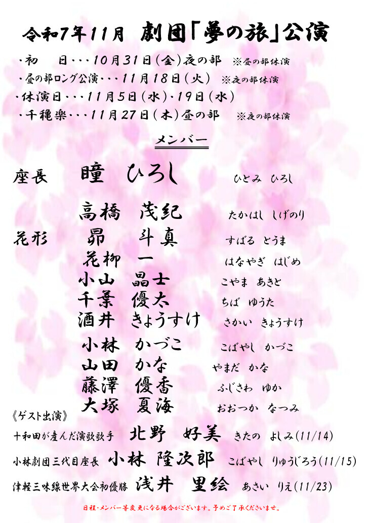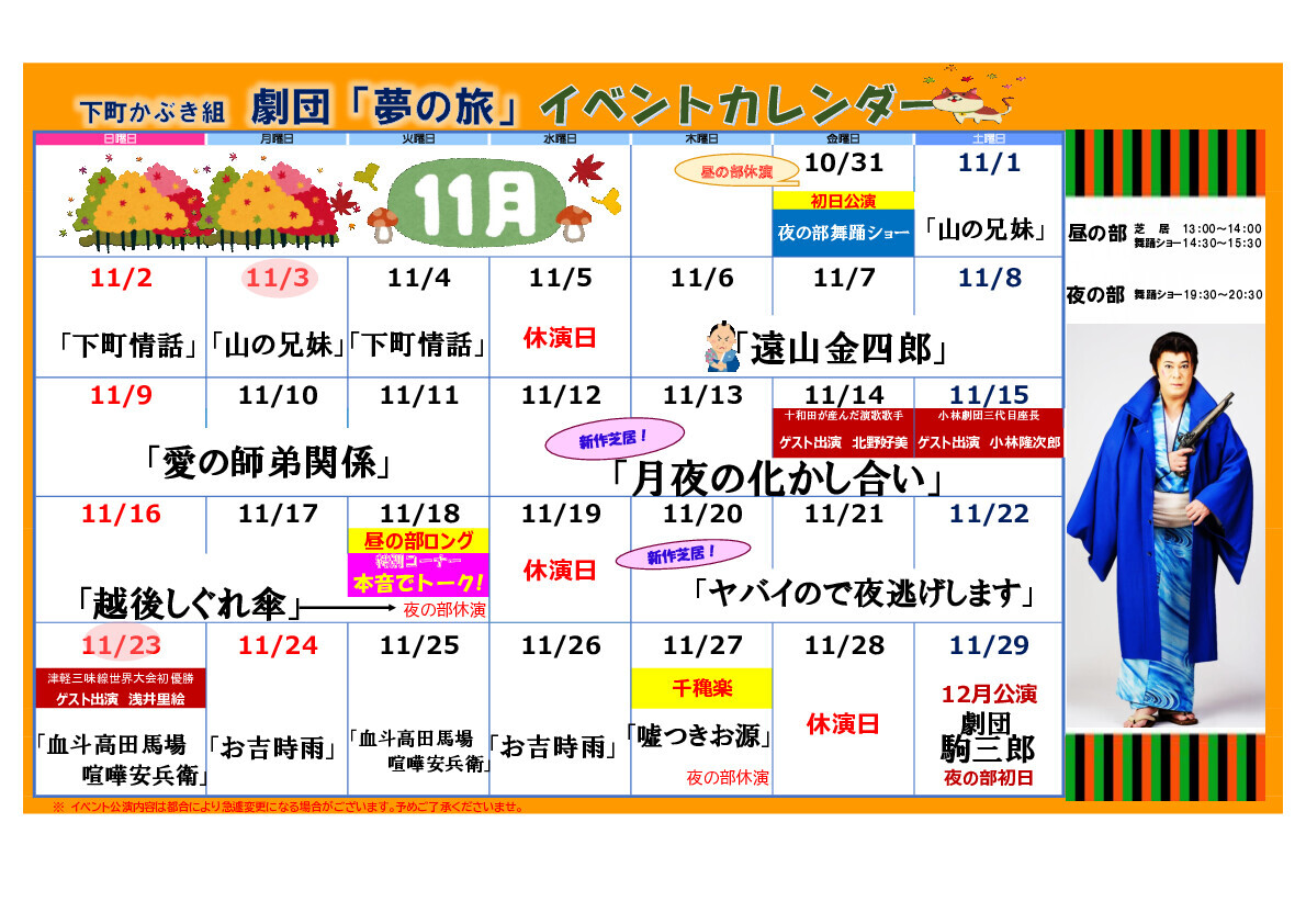 令和7年11月は、下町かぶき組 劇団「夢の旅」を予定しております。