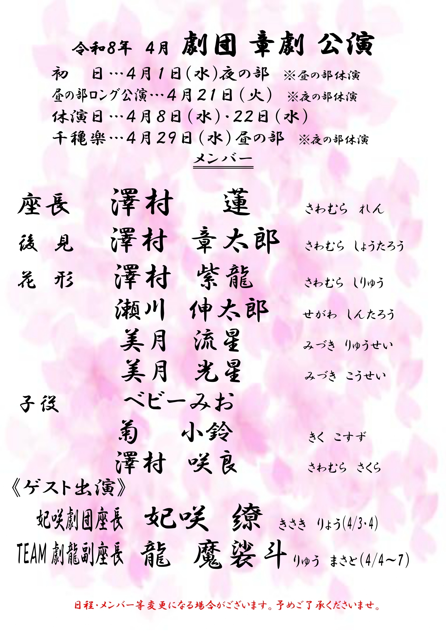 令和8年4月は、劇団「章劇」公演を予定しております。