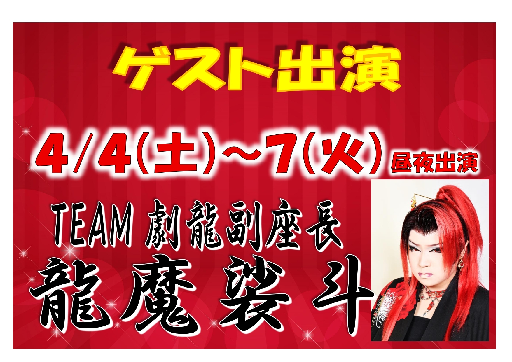 ・TEAM劇龍副座長 龍魔裟斗…4月4日(土)~7日(火)昼夜出演←NEW!!