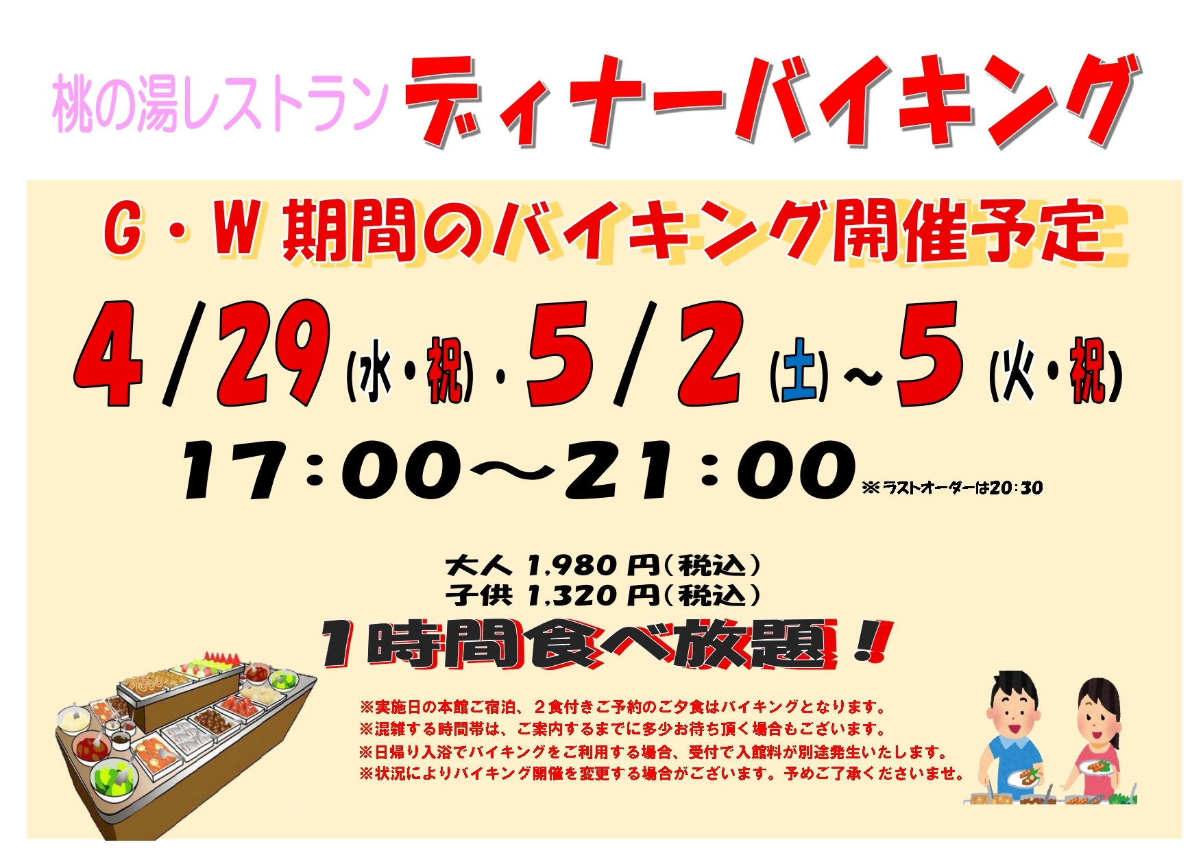 料金 大人1,980円 子供1,320円 (1時間の食べ放題)
